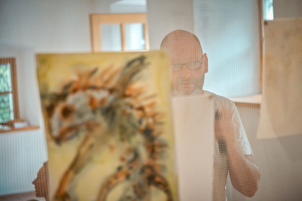 Autorská výstava maliarky Juliany Mrvovej Growing Newts prepája dva cykly obrazov, na ktorých autorka v poslednom období pracuje. Mloci ako európski draci prepožičali výstave aj názov, avšak okrem rastu mlokov je v ňom obsiahnuté aj pestovanie. Nie ani tak vypestovanie samotných mlokov ako skôr rastlín, ktorými sú namaľované, kedže diela na výstave sú vytvorené prevažne prírodnými farbivami z autorkinej záhrady a sadu. Druhým cyklom je Plodná záhrada, miesto kde sa erotika spája s biodiverzitou a kde s minimálnym zásahom človeka prežíva divočina, ktorú chce autorka pozorovať a zaznamenávať. Je to divočina za humnami, v sadoch, záhradách a parkoch, kúsok od našich domov, divočina na prvý pohľad oku skrytá, ale pritom stále prítomná. Záhrada a ovocný sad sa stávajú miestom biodiverzity, útočiskom zveri ale aj miestom rastu šťavnatých plodov, pučania a kvitnutia. Mloky ako indikátory čistoty nášho prostredia sú symbolom divočiny, ktorú svojimi (často dobre myslenými) zásahmi príliš ľahko zničíme. Jazierka a tôňky potokov, v ktorých sa pária mloky a vyrastajú maličké salamandry trpia nielen dlhými letnými suchami ale aj odvodňovaním a upravovaním krajiny. Autorka však verí, že v ktorejkoľvek záhrade či sade, kde sa rozhodneme „gazdovať“ spolu s prírodou a nie proti nej, dokážeme vytvoriť miesto pre veľké množstvo zdanlivo nenápadných, ale pritom prekvapivo krásnych a nápaditých druhov a pretvárať tak krajinu v súlade potrieb človeka a prírody. Mloky a ich krajina, „vypestovaná“ Mrvovou na jej vlastnej záhrade nám tak dávajú šancu zažiť divočinu okolo nás, ktorú by sme si inak možno ani nevšimli.
